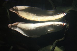 Many Amazon fish, unfortunately, wind up being harvested for the pet trade. While beautiful and interesting, most hobbyists and pet owners are not prepared to handle the size and care requirements that these fish need as they get older. All of the fish in this exhibit have been rescued from people who did not have large enough facilities to keep them. For instance, red pacus (Piaractus brachypomus) are often sold as pets when they are the size of a quarter, but they quickly grow to twelve inches in length, and they eventually grow to four feet!